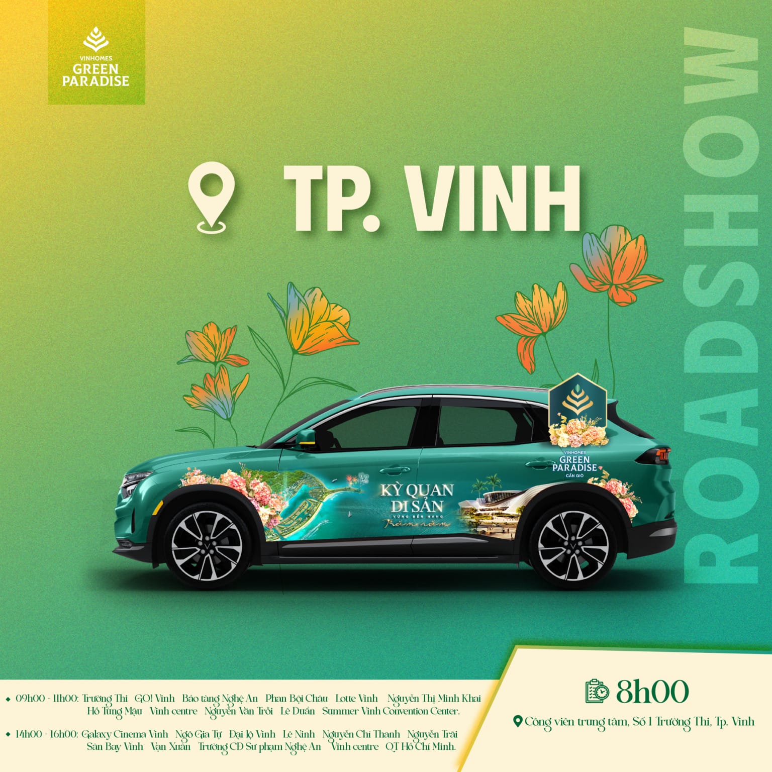 Chiến dịch roadshow được tổ chức đồng thời tại nhiều thành phố lớn như Hà Nội, TP Hồ Chí Minh và TP Vinh, với sự tham gia của hàng trăm chiến binh sales cùng đoàn xe VinFast mang nhận diện thương hiệu dự án.